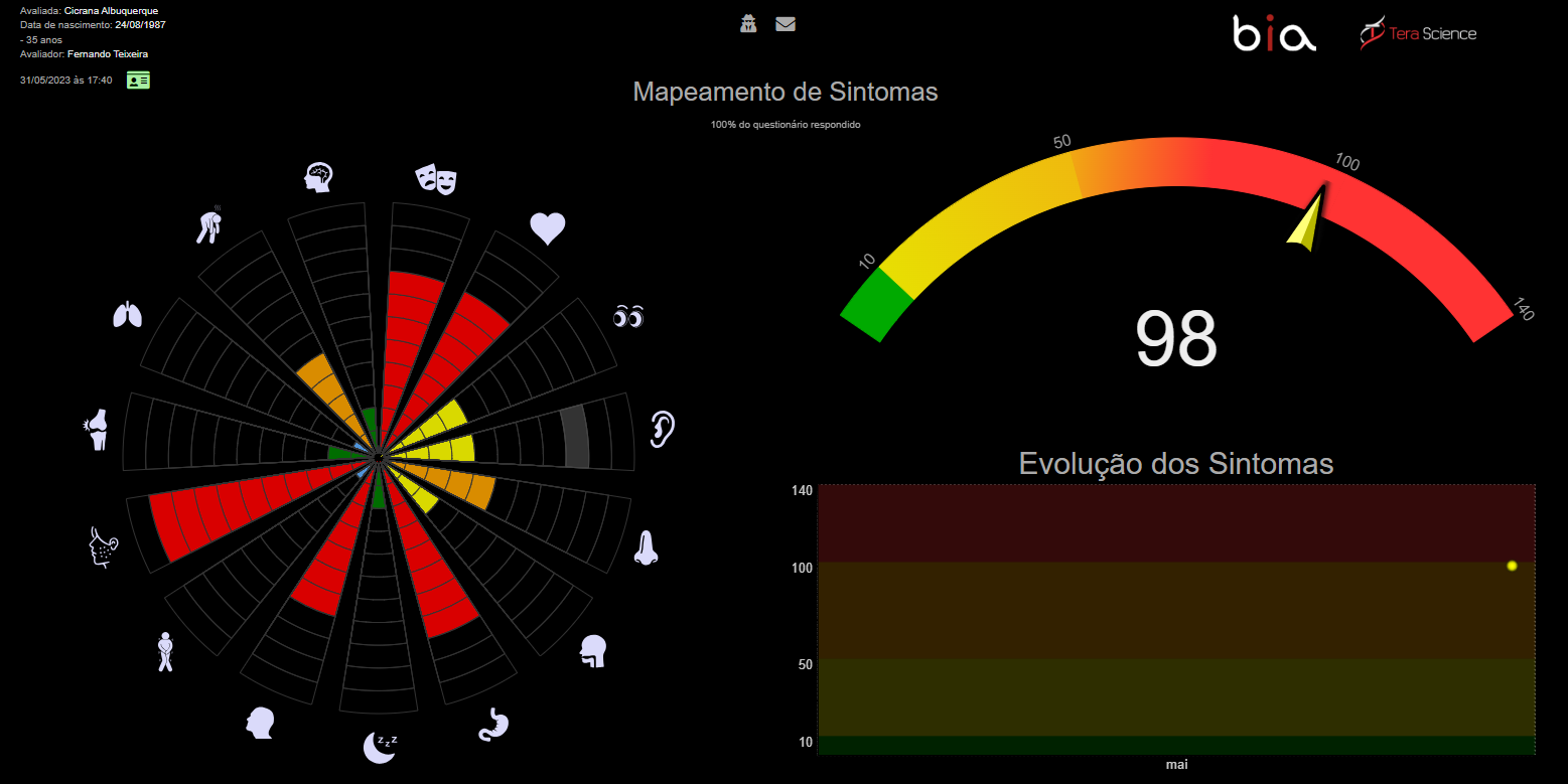 Além do agrupamento dos sintomas relatados, o mapeamento é, também, composto por uma pontuação e um gráfico de evolução. Dessa forma, você pode acompanhar a evolução do seu cliente ao longo do tempo.