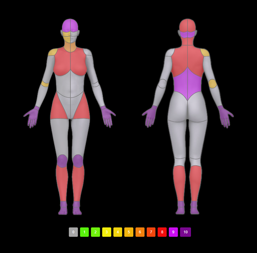 o profissional marca a dor diretamente em uma imagem corporal (frente e verso).