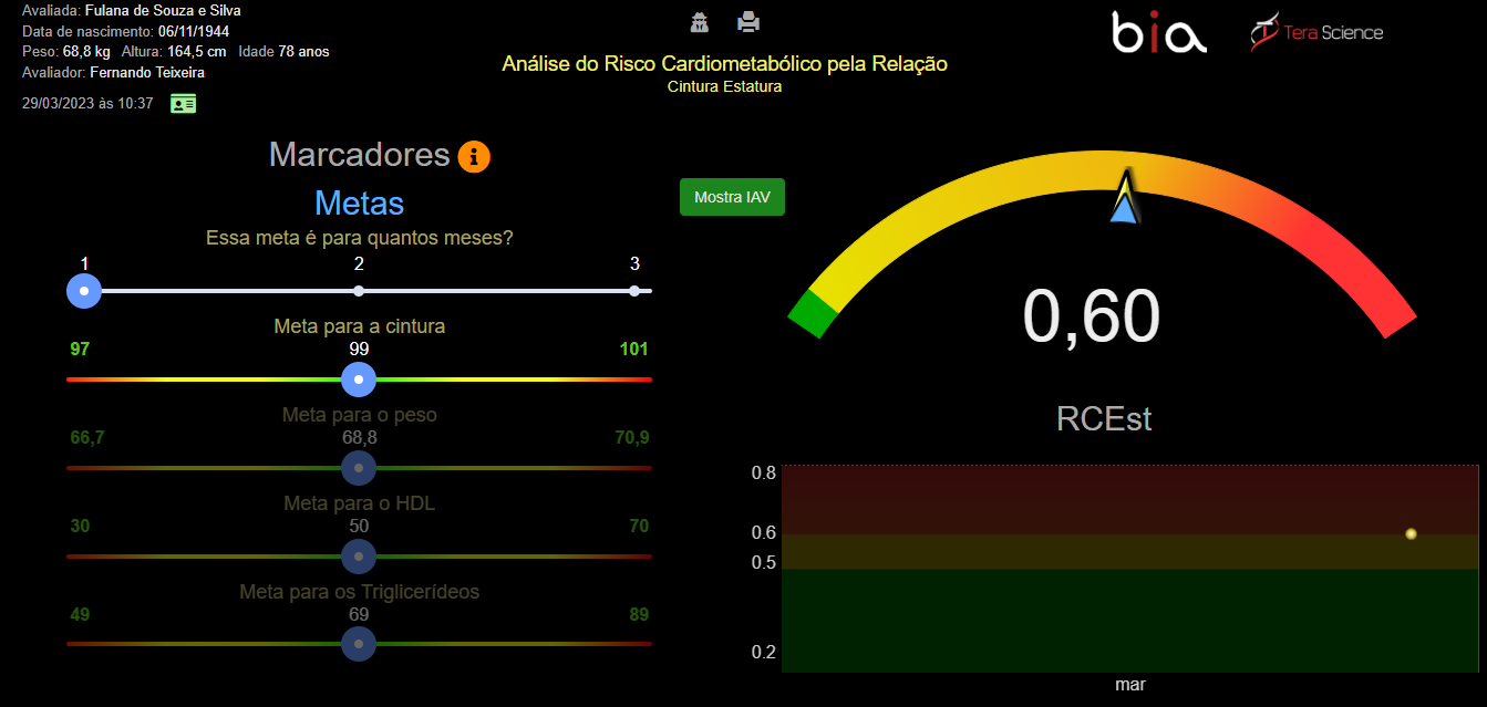 Esse biomarcador indica o risco de desenvolvimento de uma doença cardiometabólica (obesidade, diabetes, hipertensão) através de algumas medidas. Se o ponteiro estiver indicado na região verde, o risco é baixo. Se estiver na região amarela ou vermelha, o risco vai de alto a muito alto.